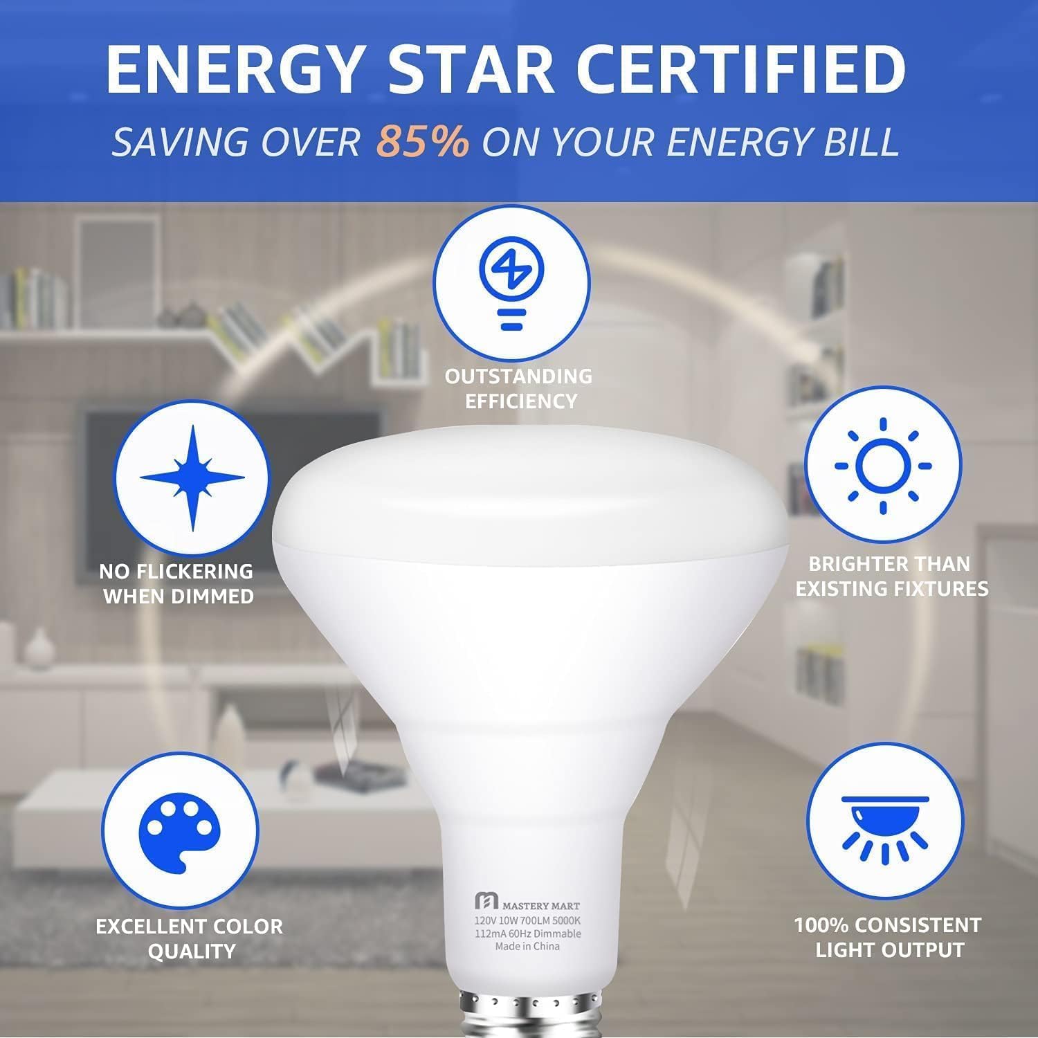 - 💡 Multiple pack of BR30 shape white bulb with e26 base. 10 Watt, 700 lumens. Dimmable. Energy Star, UL-certified. 100 Beam Angle.